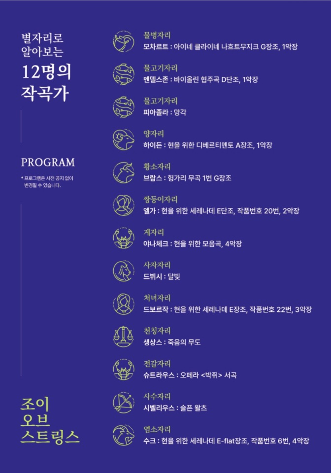 자유분방한 성격으로 알려진 물병자리 모차르트의 '아이네 클라이네 나흐트무지크'로 부터 낭만적이고 상상력이 풍부한 멘델스존의 '바이올린 협주곡 D단조' 그리고 물고기자리 피아졸라, 양자리 하이든, 황소자리 브람스 등 다양한 작곡가의 음악을 선보일 예정이다.